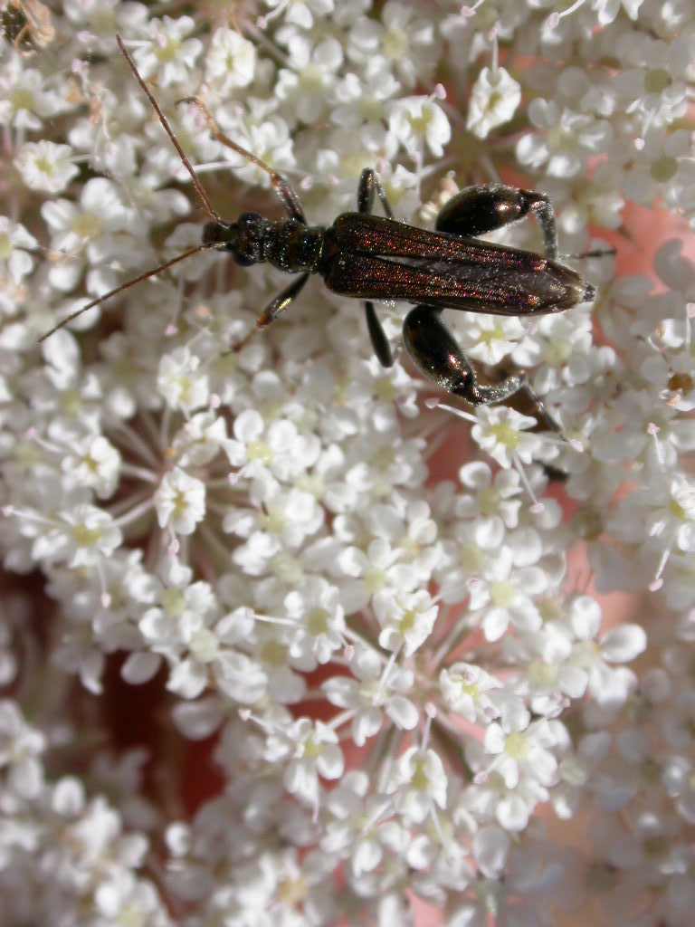 Dietro la spiaggia sabbiosa, tra gli arbusti, si dipanano diversi sentieri: sono ottimi punti di passaggio per vari imenotteri, tra cui mutillidi e crisidi (che non ho fotografato per questioni di velocità di volo eccessiva… :to: ): di seguito, un maschio di P. sardiniensis appeso su Calicotome villosa (al crepuscolo saranno più frequenti), un bell’esemplare di Strictoleptura cordigera su fiori di Daucus carota , nella sua elengantissima livrea; un edemeride dal colore purpureo, purtroppo reso male dalla foto: