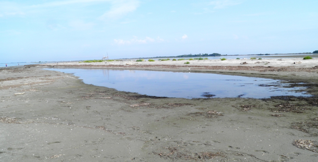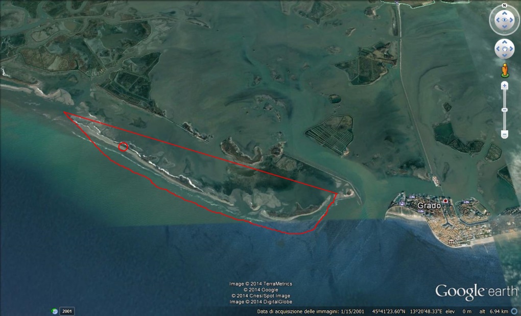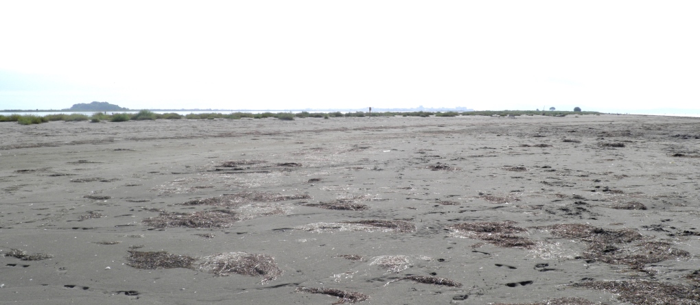 In questa foto si vede bene la larghezza del Banco d'Orio nel punto in cui mi trovavo, circa 60 m con a Sx la laguna e a dx il mare Adriatico - sullo sfondo Grado.