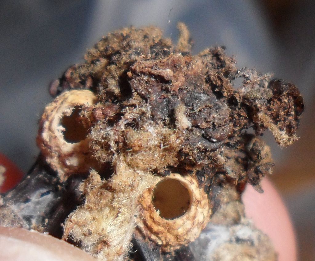 qui il costruttore si è già involato. Il foro ampio e regoalre conferma che dai loculi sono sfarfallati non calcidoidei o altri parassiti, bensì le femmine agamiche di questa specie. Bravo Marco, bella documentazione!