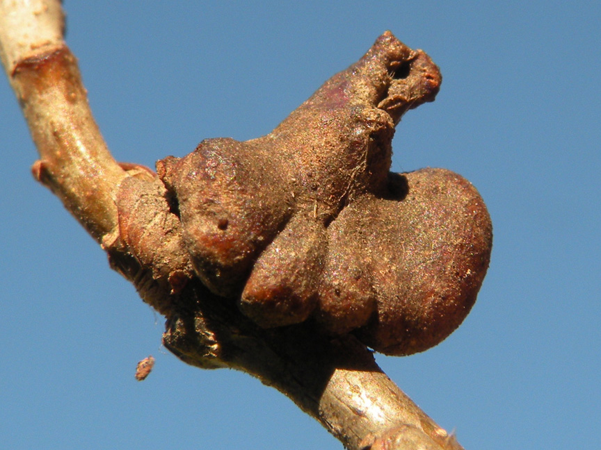 La galla in questione, come si può facilmente vedere, abbraccia il ramo, un ramo di farnia per la precisione. Purtroppo non ho immagini della galla sezionata, che dovrebbe presentare un solo loculo. Tuttavia in una descrizione ho letto che presenta protuberanze acute, non arrotondate od ottuse.