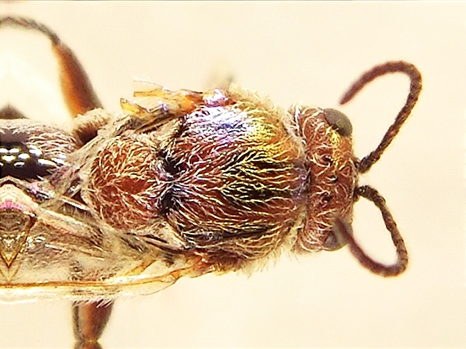 confermo la prima ipotesi Andricus sp.. Non ho trovato, tuttavia nessun campione nella mia raccolta di Andricus che lasci almeno ipotizzare la specie. Soprattutto non ho femmine agamiche (come la tua) che presentino una pubescenza così lunga, quasi da "Cynips", non è osservabile nella prima foto. Se vuoi mostra una foto laterale che permetta di osservare la "pelosità" dell'esemplare soprattutto alla estremità posteriore ventrale dell'addome per escludere il genere Cynips.