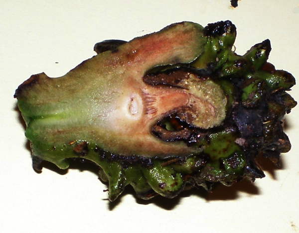 Ciao Salvo, scusa il ritardo con cui posto la sezione della galla: a mio avviso la galla (tale è, vista la celletta che sta al fondo) si è sviluppata sull'abbozzo di una seconda ghianda come pare essere la parte basale. Nella seconda foto, è evidente una cavità trofica ampia alla base del cecidio ove si trova anche il "bozzolo" pupale, che nel sezionare la galla si è un po' rotto: allo stereo si vede che all'interno vi è un adulto formato, quasi sicuramente un Andricus. Se serve si può estrarre l'adulto anche se so che non è facile determinare tali exx.