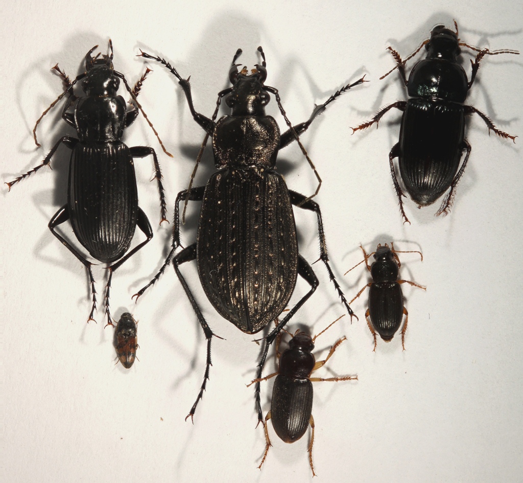 Una femmina di Carabus granulatus interstitialis, specie che trovo di frequente in queste zone. Non mi pare di aver mai raccolto in quest'ambiente il carabide maschio alla sua sinistra: si capisce cos'è da questa foto? Poi un piccolo elateride (mi pare), abbastanza comune qui.