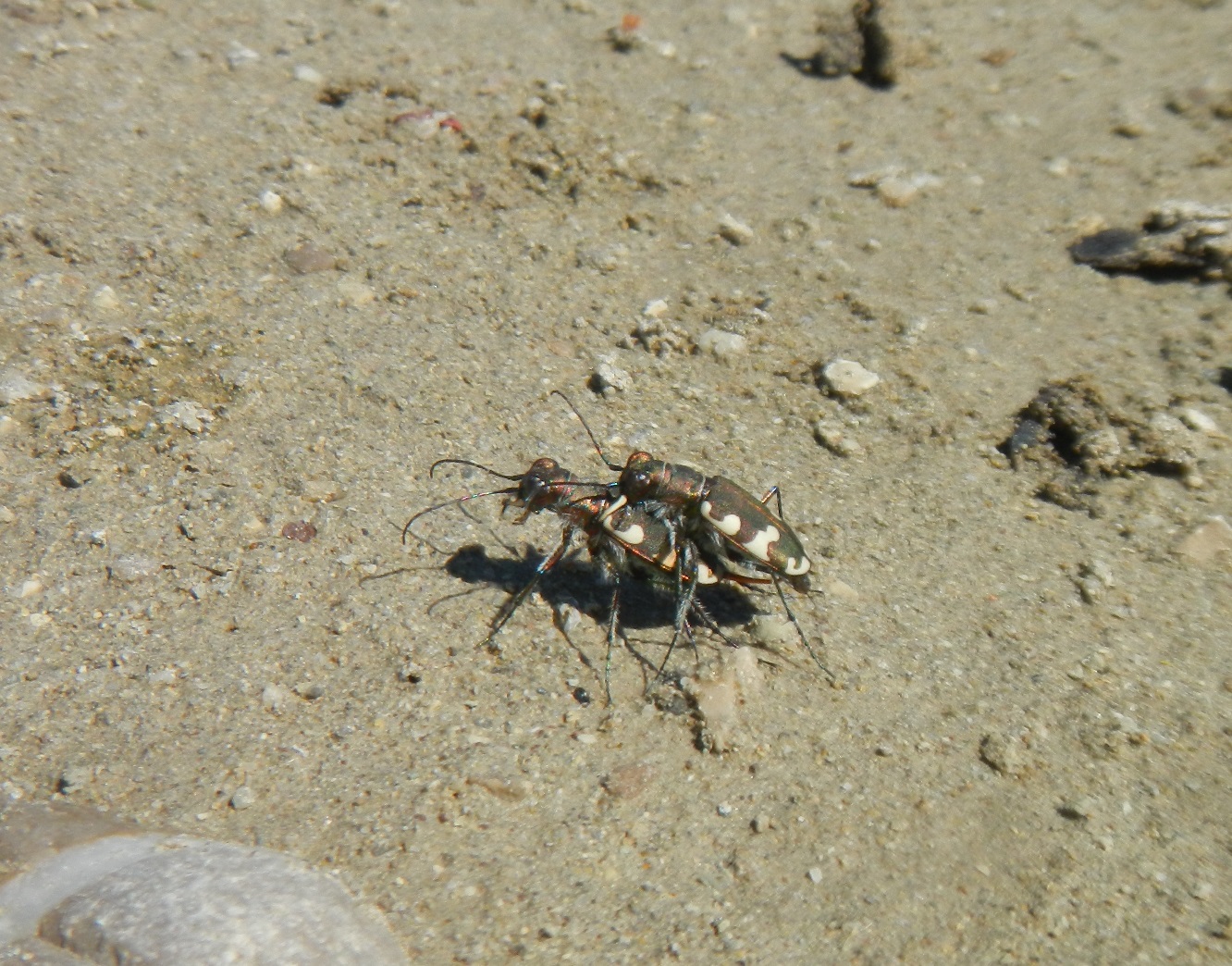 Il Marecchia è un fiume romagnolo caratterizzato da un letto molto ampio per via del suo regime torrentizio. Tende infatti ad avere grandi piene invernali mentre in estate rimangono solo piccoli rigagnoli intrecciati. Queste condizioni hanno modellato in modo peculiare il suo greto, creando ambienti d'acqua corrente e ferma. Il fiume sfocia presso la città di Rimini. Pochi giorni fa, insieme ad altri entomologi (Giorgio e Nicola), sono stato lungo questo fiume per dedicarmi alla ricerca dei Bembidiini e di qualche cicindela (speravo nella Cylindera arenaria, ma non si è vista). Ci fermiamo in due diverse stazioni, una a valle nei pressi di Secchiano ed una a monte in località Campaccio. In entrambi i casi la fauna di Carabidi risultava molto ricca, con diverse specie e numerosissimi individui. Questo l'ambiente presso Secchiano, dove scorreva uno dei torrentelli. Lungo le sponde si erano seccati degli ammassi di alghe sotto ai quali c'era un via vai di carabidi e stafilinidi di ogni sorta. Altrove, dove il torrente aveva cambiato corso o semplicemente si era seccato rimanevano delle fasce longitudinali a fondo sabbioso che in alcuni casi ospitavano delle pozze d'acqua ferma. Qui abbondano Dyschiriodes ( nitidus e agnatus soprattutto), Omophron limbatum, vari Bembidiini di acque ferme e moltissime Cicindela majalis. Cicindela majalis in accoppiamento. Le ricerche vengono poi concentrate sotto al ponte, dove l'ombra concede una tregua dal sole cocente sia ai coleotteri che agli entomologi che li cercano. E' qui che avviene l'incontro con le specie di maggior valore: Ocydromus eques e Ocydromus monticola. Di monticola solo uno (chissà cosa ci faceva lì  Io la consideravo una specie di zone fresche montane), mentre di eques ne trovo 6 esemplari, per la maggior parte sotto l'ombra del ponte. Però me li sono dovuti sudare! Ho rivoltato tutti i sassi nel raggio di mezzo metro dalla sponda per raccoglierli. Presso la località di Campaccio (dintorni Sant'Agata Feltria) il fiume ha caratteristiche simili ma ha sponde più ciottolose. E qui invece, anche in pieno sole, gli Ocydromus eques sono più abbondanti (ne prendo 10)  . In particolare, secondo le mie osservazioni, la specie vive tra i sassi vicinissima all'acqua, anzi, in alcuni casi l'ho presa in piccole isole effimere nel mezzo del torrente, formate da sassi sotto ai quali scorre l'acqua. Qui vivevano esemplari maturi e non. Probabilmente il periodo migliore per trovarlo è luglio-agosto, anche mediante trappole luminose. Eccolo in tutto il suo splendore. Una curiosità: è anche, insieme all'affine nobile, il più grande Bembidiino italiano. I più grossi che ho preso superano il centimetro. Marco