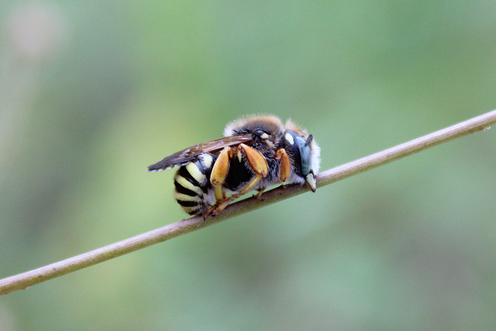 Innumerevoli Anthidiellum strigatum. Quasi è strano vederli così fermi e tranquilli, durante il giorno non si posano mai e si rincorrono continuamente tra i fiori di una Fabacea dai fiori gialli.