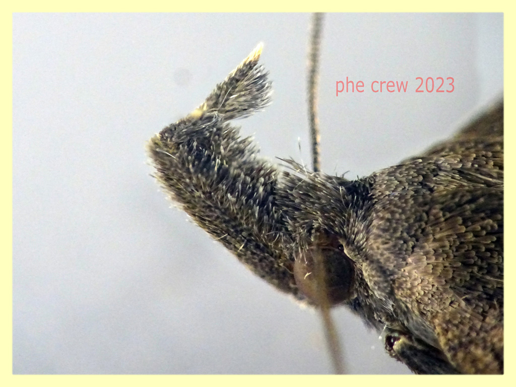 ...Pechipogo plumigeralis femmina appena sfarfallata con le ali ancora stropicciate. Ho trovato la crisalide appena sotto la superficie della terra mentre tagliavo l' erba.