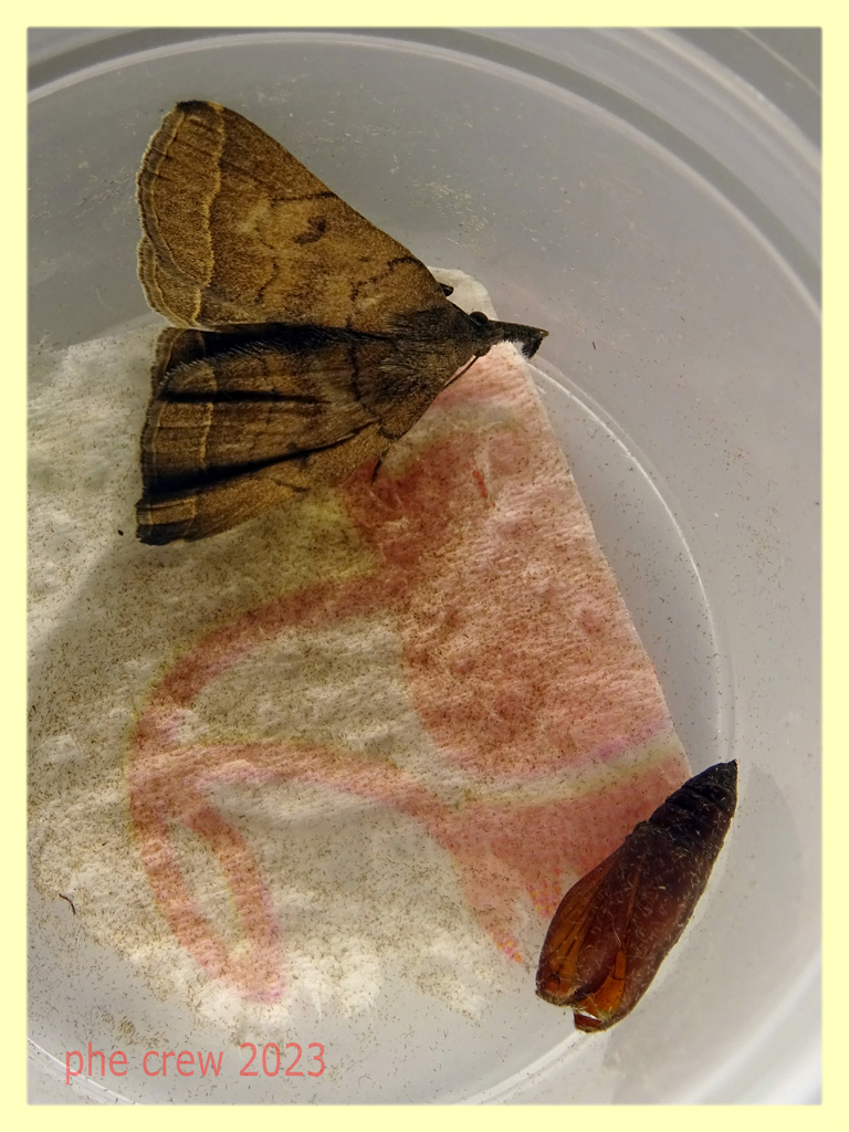 ...Pechipogo plumigeralis femmina appena sfarfallata con le ali ancora stropicciate. Ho trovato la crisalide appena sotto la superficie della terra mentre tagliavo l' erba. crisalide 13 mm. 22.5.2023 adulto 27.5.2023 esuvia della crisalide |