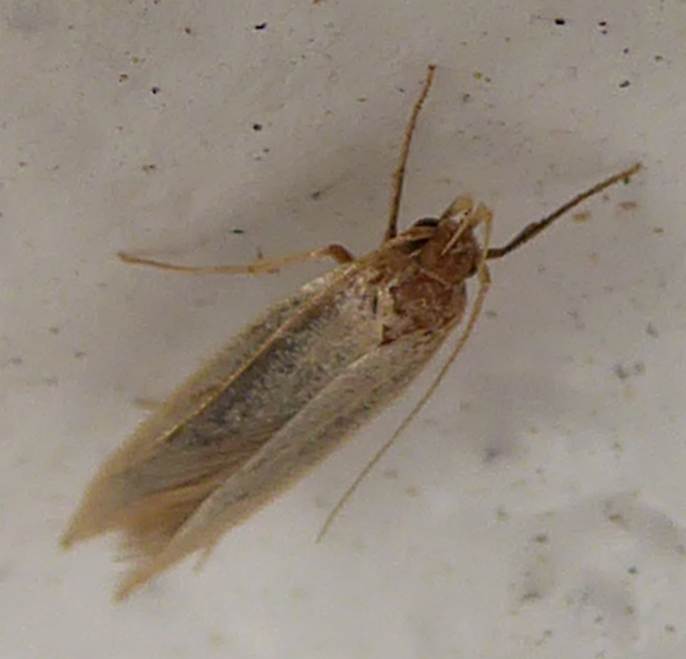 Esemplare piuttosto desquamato e danneggiato, tutt'altro che ideale per un'identificazione sicura. Le ali anteriori strettamente lanceolate, l'abbondante frangia e soprattutto i palpi lunghi e marcatamente arcuati verso il dorso possono far pensare anche ai Gelechiidi, ad esempio alla Sitotroga cerealella. Sarebbe stato utile poter vedere la forma delle ali posteriori. Era all'interno o sull'esterno della porta di casa?