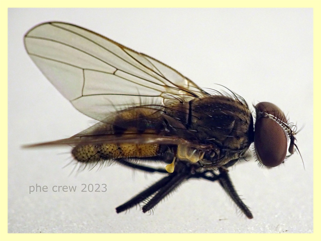 Nel tentativo, spesso frustrante, di venire a capo di qualcosa con i Calyptratae, di norma è pressoché indispensabile poter osservare con precisione la chetotassi delle tibie posteriori e l'andamento delle due vene anali. Un altro carattere diagnostico importante è la presenza o meno di peluria sotto lo scutello. Tutti caratteri qui non rilevabili, ma sono quasi sicuro che non si tratti di Anthomyiidae ma di Fanniidae. Maschio, forse di Fannia canicularis (Linnaeus, 1757).