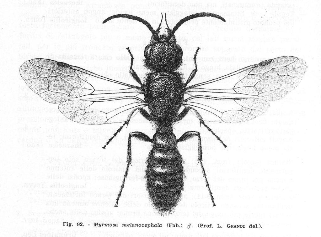 Conosco bene questi due splendidi disegni che ritraggono due specie oggi comprese nella famiglia Mutillidae (Subfam. Myrmosinae). Quelli presenti in Fauna d'Italia (Vol. V, 1964 - Mutillidae e Myrmosidae a cura di F. Invrea) sono però delle riproduzioni ridotte dei due disegni originali, comparsi per la prima volta nel 1952 a corredo del lavoro di F. Invrea "I Mirmosidi d'Italia" (Memorie Società entomologica italiana, Genova, 31: 5-21). In questo contributo i disegni sono presentati a tutta pagina e la loro perfezione risalta in modo ancor più evidente. Devo notare che, almeno in questo caso, non furono subito riconosciuti alla prof.ssa Lea Grandi Fioresi i meriti che le sarebbero spettati. Infatti i due disegni apparsi nel lavoro del 1952, a differenza di quelli poi riprodotti nella Fauna d'Italia e mostrati prima di Rinaldo, non riportano alcuna indicazione sul loro Autore e, nella parte dedicata ai ringraziamenti, il Marchese Fabio Invrea così scrive nell'introduzione, senza altro aggiungere: "...devo infine esprimere la più calda riconoscenza all'illustre Prof. Guido Grandi, Direttore dell'Istituto di Entomologia dell'Università di Bologna, per le belle riproduzioni di due Myrmosa che adornano il presente lavoro, i cui disegni originali, di rara perfezione, egli ha voluto fare eseguire nel suo Istituto..." |
