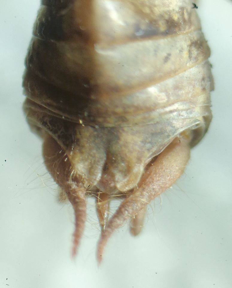 Documento questa specie dopo conferma di Marco Villani e dopo che tra tante femmine ho trovato un maschio. mm 17 il maschio, mm 20 femmina escluso ovopositore. Le foto mostrano anche le due spinette interne dei lobi apicali del mesofemore e l'aspetto dei lobi del X tergite del maschio, espansi, a profilo rotondo, separati da una stretta incisura, diagnostici della specie, diffusa sulle Alpi a quote non troppo elevate, dalla Lombardia al FVG. La data è quella di ritiro delle trappole ad aceto poste 40 gg prima.