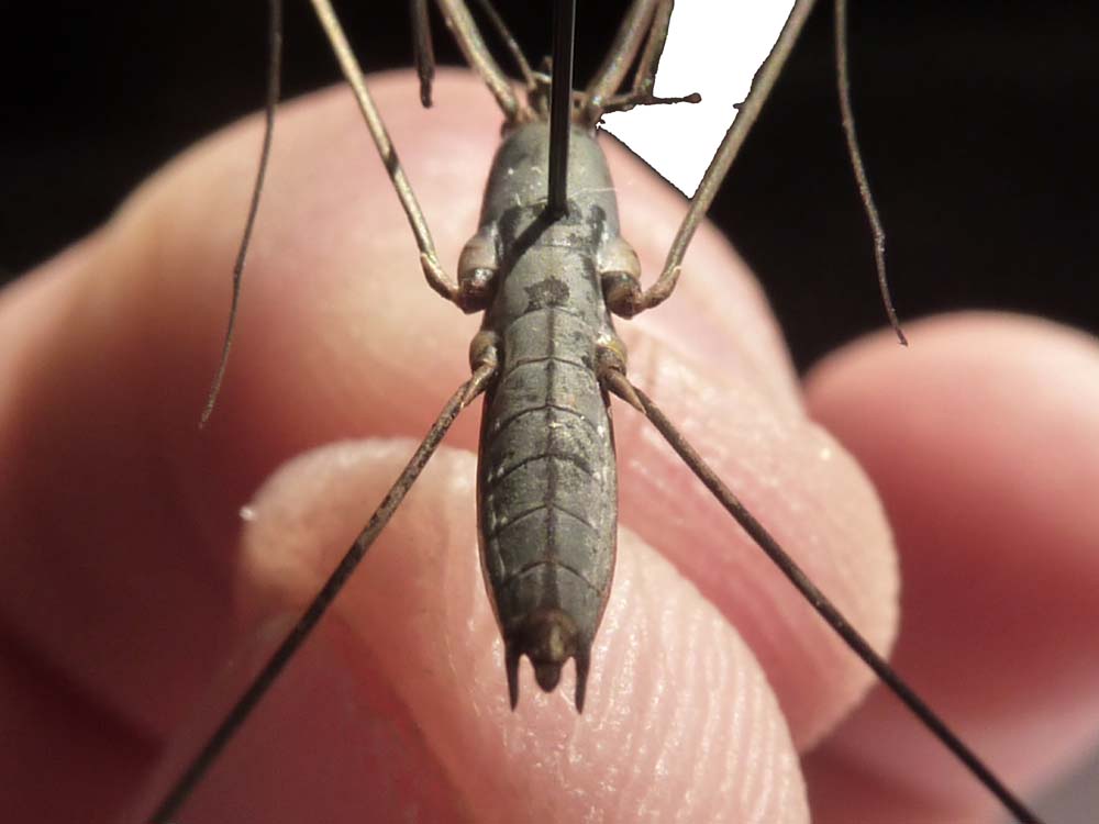 Le lunghe ipofisi all'estremità dell'addome che oltrepassano il segmento genitale e la colorazione molto scura ci indicano che si tratta di Gerris (Aquarius) paludum (Fabricius, 1794)