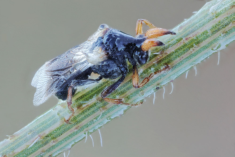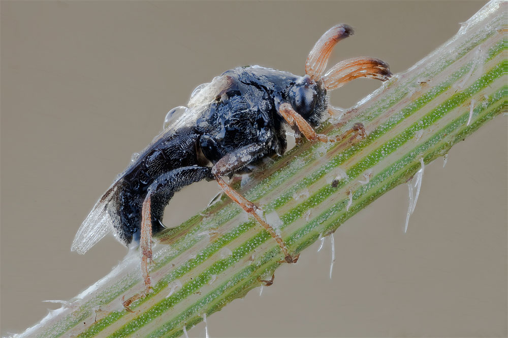 Quello che mi lascia perplesso è che questa mattina in una sterpaglia ho incontrato due esemplari uno è questo. meno di cinque millimetri con addome nero; l'altro, che mi ripropongo di fotografare domani (asciutto) ha invece, l'addone color ambra e una dimensione di circa un centimetro.