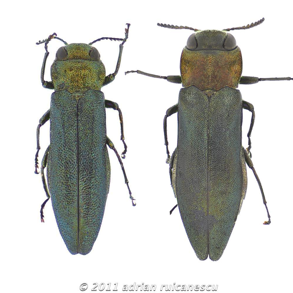 Julodis ha scritto: f.izzillo ha scritto: Debbo controllare (non sono a casa) ma non è che l'hai preso su Celtis australis o Ulmus? Stai pensando a Agrilus auricollis? Hai visto però che strano protorace ha questo esemplare? In particolare, la base del protorace è molto più stretta della base delle elitre, molto più che in auricollis. I totally agree with Maurizio. It is not Agrilus auricollis. I have tens of auricollis (right) and it is smaller and slender. I put together for comparation a female of Agrilus auricollis and don't match