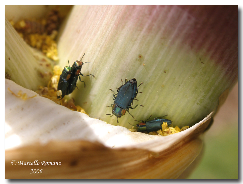 Comunque, Loris, questa specie non è floricola, ma vive esattamente come ha scritto Marcello, e come si vede nelle belle foto che ha fatto: sul fusto e specialmente al riparo della guaina fogliare, dove tra l'altro gli adulti, oltre ad accoppiarsi, si rifugiano quando c'è brutto tempo e di notte. Non mi è mai capitato di trovarne sui fiori, nemmeno della pianta ospite