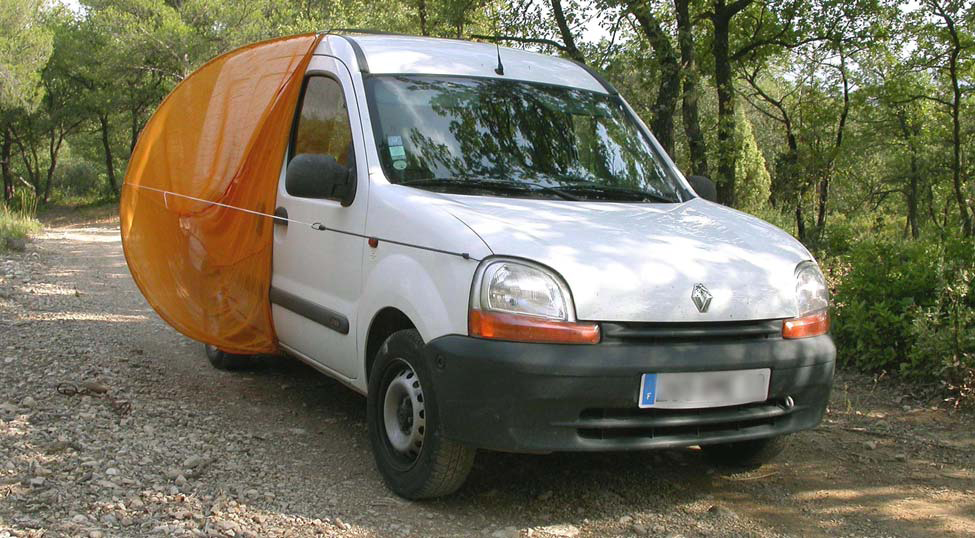 Veramente non stavo scherzando. Dicevo sul serio che mi sarebbe piacuto vedere una foto del camper con i retini montati. Che ne so, magari l'avevi scattata prima di partire! Praticamente ai fatto una versione terrestre, o meglio, aerea, dei retini per il pescaggio del plancton che si usano per raccogliere e studiare gli organismi che lo compongono sia in mare che nei laghi. So che sono stati fatti degli studi con retini (ovviamente di forma e dimensione diversa) anche in alta quota, trascinati da aerei, trovando un gran numero di invertebrati, soprattutto ragni.
