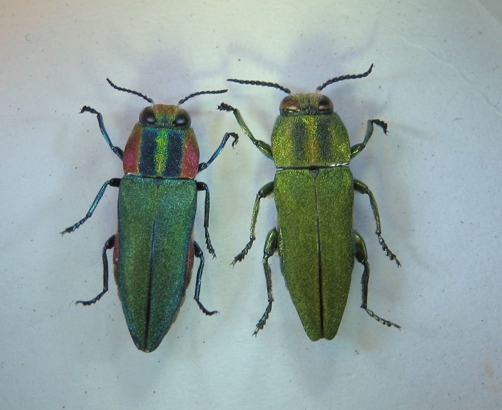 Il maschio, a destra, si presenta di colore verde brillante uniforme, a parte le due fasce più scure visibili sul pronoto.