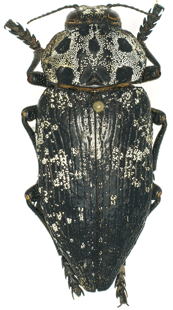 Capnodis cariosa cariosa (Pallas, 1776)Specie del Mediterraneo orientale e Medio Oriente, a Est fino ad Ucraina, Turchia ed Iraq, e ad Ovest fino all'Italia. Segnalata in Italia di Toscana, Marche, Lazio, Italia meridionale e Sicilia. Non risulta segnalato di Sardegna, ma io personalmente, l'unica volta che ci sono stato, ho visto un esemplare di questa specie partire in volo dal ponte del traghetto in prossimità del porto di Olbia e dirigersi verso le colline lungo la costa. Non mi meraviglierei quindi se se ne trovasse una popolazione, magari di recente importazione involontaria. Questa specie vive allo stato larvale nelle radici degli arbusti del genere Pistacia. In Italia attacca sia Pistacia lentiscus, sia Pistacia terebinthus. L'adulto si trova sui rametti e tra il fogliame delle piante ospiti, ed ha una fenologia molto lunga, comprendente almeno tutta la primavera e l'estate. Probabilmente alcuni adulti svernano e tornano in attività la primavera successiva. E' uno dei Buprestidi più grandi della nostra Fauna. Lazio, Roma, Maccarese, 19.V.1982, su Pistacia lentiscus, M. Gigli legit 36 mm Questo invece è stato fotografato sulle colline presso Tivoli (RM), su arbusti di Pistacia terebinthus, il 2.V.2008.