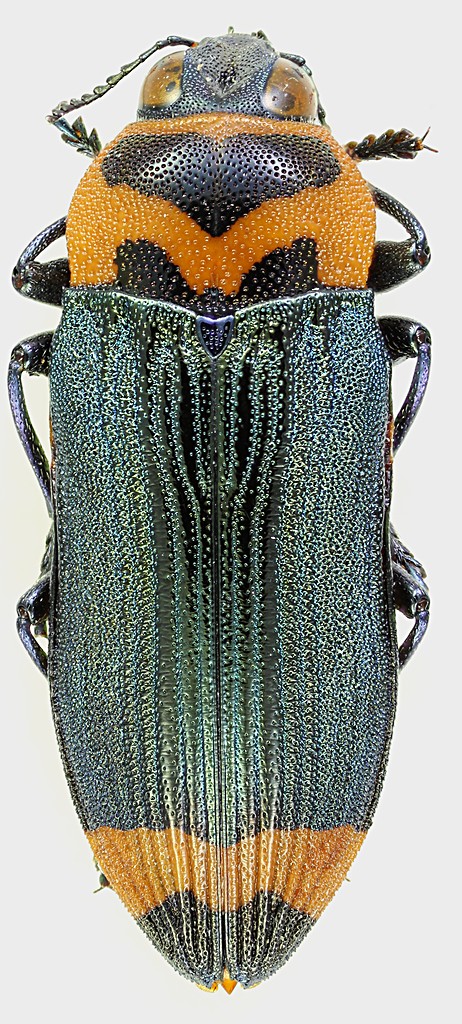 Un'altra Castiarina dalla livrea insolita. Questa apparentemente sembrerebbe imitare un Cantharidae, tanto che la similitudine di colori si estende anche al lato ventrale.