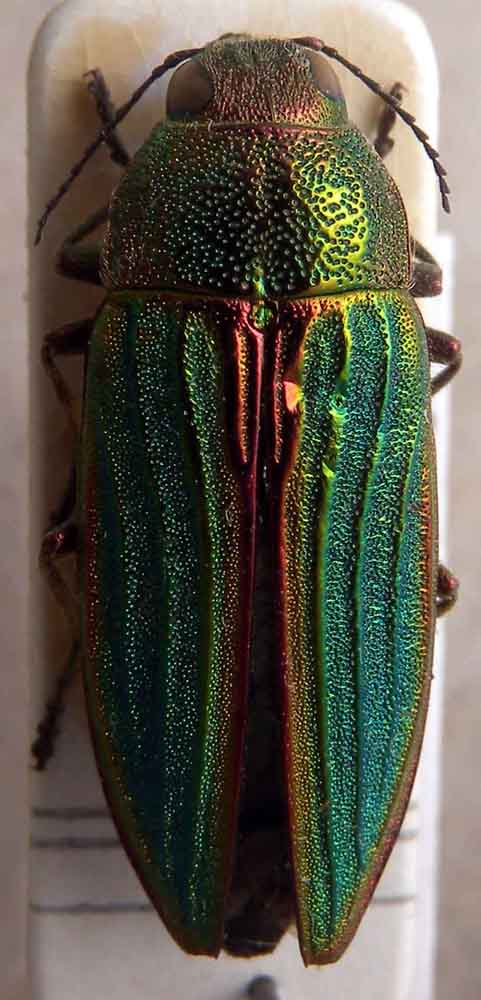 La prima è la specie trovata da Gianfranco a Carmagnola, ovviamente importata col legname, visto che vive in Nord America (dove è piuttosto comune, a differenza del nostro Buprestis splendens, tanto simile come aspetto, ma molto più raro).