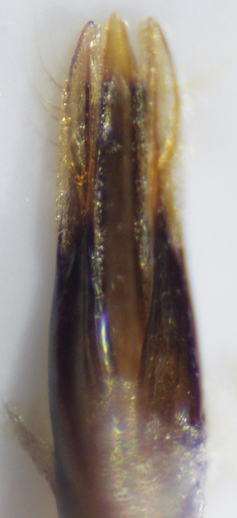Las expansiones hialinas del extremo de los parámeros se ven muy delgadas, de forma similar al edeago de mendizabali. Mientras que las de chevrieri, spinolae, funerula, etc. son bastante anchas.