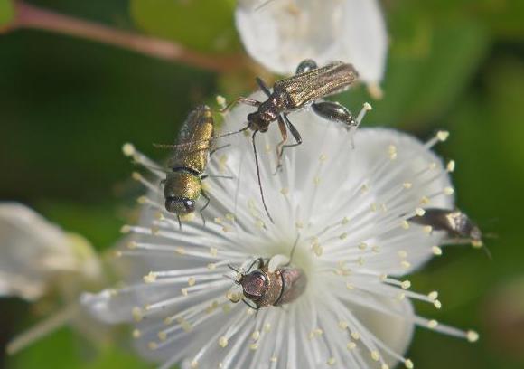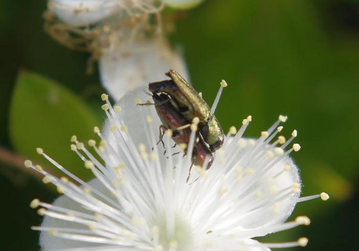 A proposito di questa bella specie...ecco alcune foto in natura dell'amico Costantino D'antonio che ritraggono una coppia di questa Anthaxia sull'isola di Vivara (NA) dove l'aprutiana frequenta quasi esclusivamente i fiori del Myrto anche a causa del fatto che una esplosione demografica di conigli ha fatto si che, virtualmente, scomparissero il Daucus e l' Achillea.
