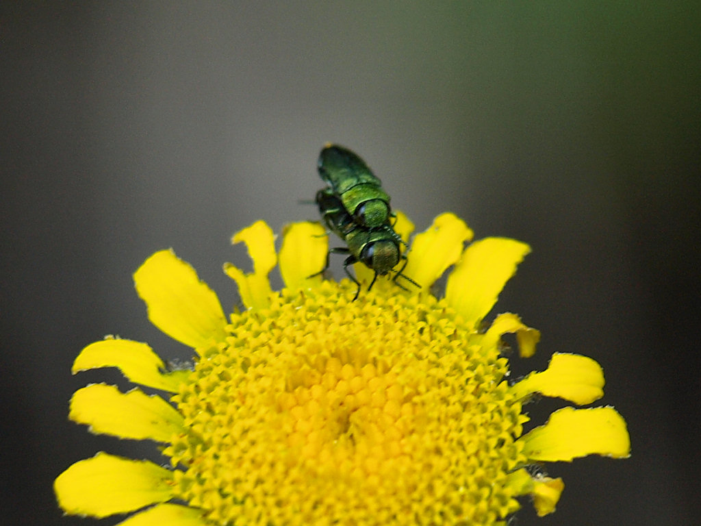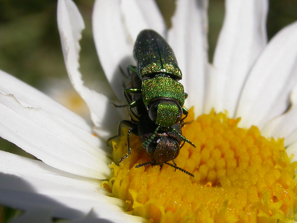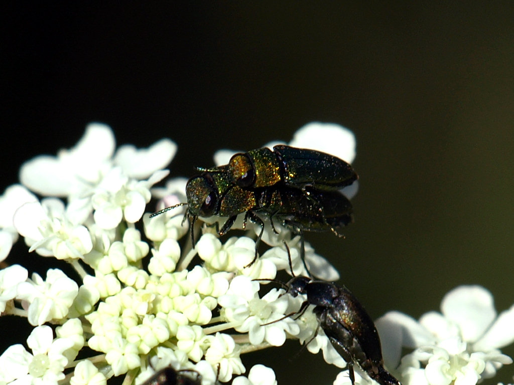 La popolazione di A.millefolii polychloros in questa limitata fascia di territorio presenta tutte le femmine androcrome (almeno, tutte quelle viste da me in diversi anni, e sono parecchie). Quando credevo di aver trovato femmine scure, "normali", mi accorgevo poi, controllandole meglio, che altro non erano che Anthaxia umbellatarum, su cui andavano, evidentemente per sbaglio, dei maschi di millefolii polychloros. Del resto, frequentano gli stessi fiori nello stesso momento, come si vede da quest'altra foto, sempre di san Vittorino, con una coppia di umbellatarum (scure) e una di polychloros (verdi).