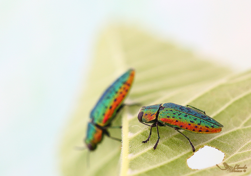 Come annunciato qui,volevo oggi proporvi qualche scatto di alcuni dei oltre 25 esemplari nati dai stessi tronchetti di olmo. Immagini scattate da esemplari vivi, liberi nel box di allevamento con rami freschi di olmo. Osservando il comportamento di questo bel Buprestide, devo ammettere che non mi aspettavo una simile voracità. Un solo esemplare nell'arco di 20 minuti riesce a divorare una quantità di foglia di una superficie tripla, della grandezza del proprio corpo.