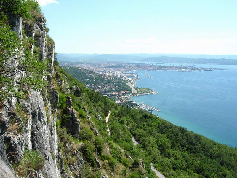 Scogliera di Prosecco, in alto al centro il paese di Prosecco, sullo sfondo a Sx il castello di Miramare