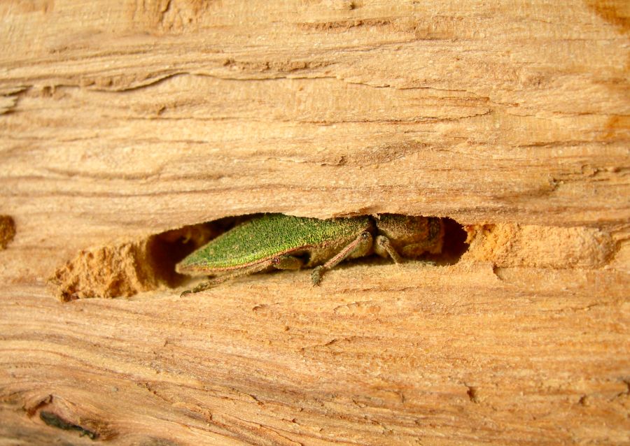 Proprio ieri ho osservato questa specie su alcuni piccoli lecci morti, ma rimasti in piedi, e con legno ancora molto duro. I fori di uscita sono molto allungati e di solito sono perpendicolari alle fibre. Mi sono sorpreso che stessero già "sfarfallando" in questa stagione, e ho immortalato una scena piuttosto insolita: un Latipalpis plana predato da una ninfa di reduvide mentre usciva. (già pubblicata altrove  )  luigi