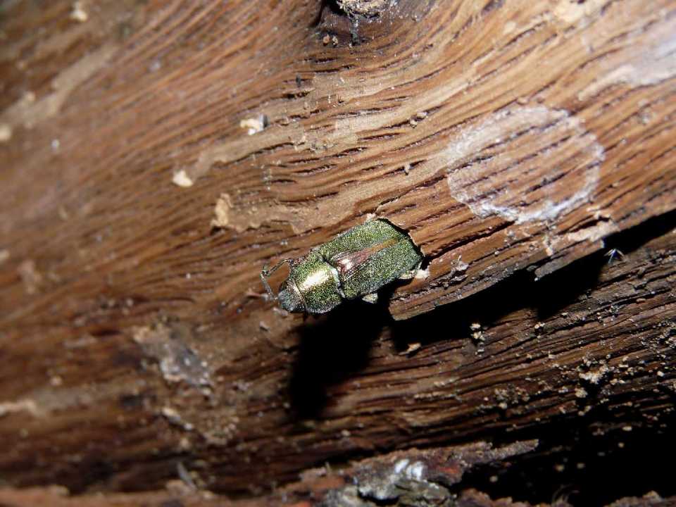 Latipalpis plana è una specie a distribuzione tirrenica; non mi pare esistano segnalazioni per le Marche. La colorazione, come ha giustamente detto Julodis, è variabile andando da un verde brillante più o meno dorato ad esemplari cyanescenti bluastri. La colorazione dell'esemplare postato rientra nella norma. Attacca varie specie di querce e in generale è animale di basse quote. In condiziioni particolari (ambienti particolarmente caldi) sale di quota al seguito delle piante ospiti. L'adulto è già pronto in celletta in autunno per cui è specie presente sul campo molto precocemente. Già ora gli adulti sono pronti ad uscire dal legname ed è possibile estrarli. Operazione che abbiamo più volte compiuto per es. a Tolfa, vicino Tivoli, etc.. L'adulto è acrodendrico ed in genere si accoppia in alto sul fogliame e depone sui rami morti delle grosse querce ma a volte le femmine scendono per la deposizione anche sui tronchi in special modo quando le querce disponibili non sono grandissime e l'albero è deperiente al punto giusto...