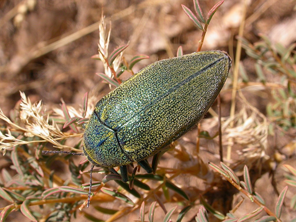 Quel che accennavo tempo fa era la possibilità che in passato almeno una specie di Julodis possa essere esistita in Sicilia. Ci sarebbe anche una vecchia citazione per quest'isola, presa sul serio da nessuno, che in realtà potrebbe anche essere fondata, e non frutto di errore di cartellinatura. Sarebbe comunque un esemplare mal determinato, come Julodis pilosa, che è specie del Marocco occidentale. Ma quello non sarebbe un problema, perché fa parte del gruppo di J. onopordi, con specie che sono in passato state spesso confuse, e che arriva a Lampedusa. Io credo, però, che molto probabilmente ora queste bestie in Sicilia non ci siano più, perché a causa del modo di vita delle larve, le loro popolazioni sono state devastate dalle arature profonde permesse dai trattori. Teoricamente non si può escludere che possano esserci ancora su alcuni rilievi xerici della Sicilia occidentale, anche se è molto difficile. Sempre che ci siano mai state. Si potrebbe pensare che una bestia di queste dimensioni non possa passare inosservata all'occhio di un entomologo, eppure non sono così facili da vedere come sembra. Sembra strano, ma su alcune piante sono molto difficili da vedere. Ricordo ancora la fatica fatta per trovare un po' di Julodis chrysesthes in Tunisia. Dopo anni di tentativi andati a vuoto, un giorno, mentre raggiungevo il Magnani che stava sfasciando la radice di un limoniastro con larve di Sphenoptera, dopo che aveva girato tutto un tratto di semideserto disseminato di piccoli arbusti, per caso ne ho visto un esemplare aggrappato ad un arbusto di non più di 30 cm, zeppo di foglioline succulente verdine e di fiorellini gialli, così come l'insetto è verde ricoperto di pruinosità gialla. In pratica, ci passi affianco e non lo vedi, pur essendo una bestia di tre cm buoni. In un'oretta, ne è uscita fuori una discreta serietta, ma sarebbe bastato non vedere il primo, e avrei continuato a pensare che quella specie fosse introvabile. Un'altra zona dove stranamente non è mai stato trovato, è la Sardegna, che pure si presterebbe per il tipo di ambiente e considerando le numerose affinità biologiche col Nord Africa, anche tra i Buprestidi. Ancor più strano considerando che il genere vive anche in Spagna e nel Sud della Francia. Ad Est, invece, una specie raggiunge l'Albania, di due presenti nei Balcani. La penisola italiana sembrerebbe invece che non siano mai riusciti a raggiungerla.