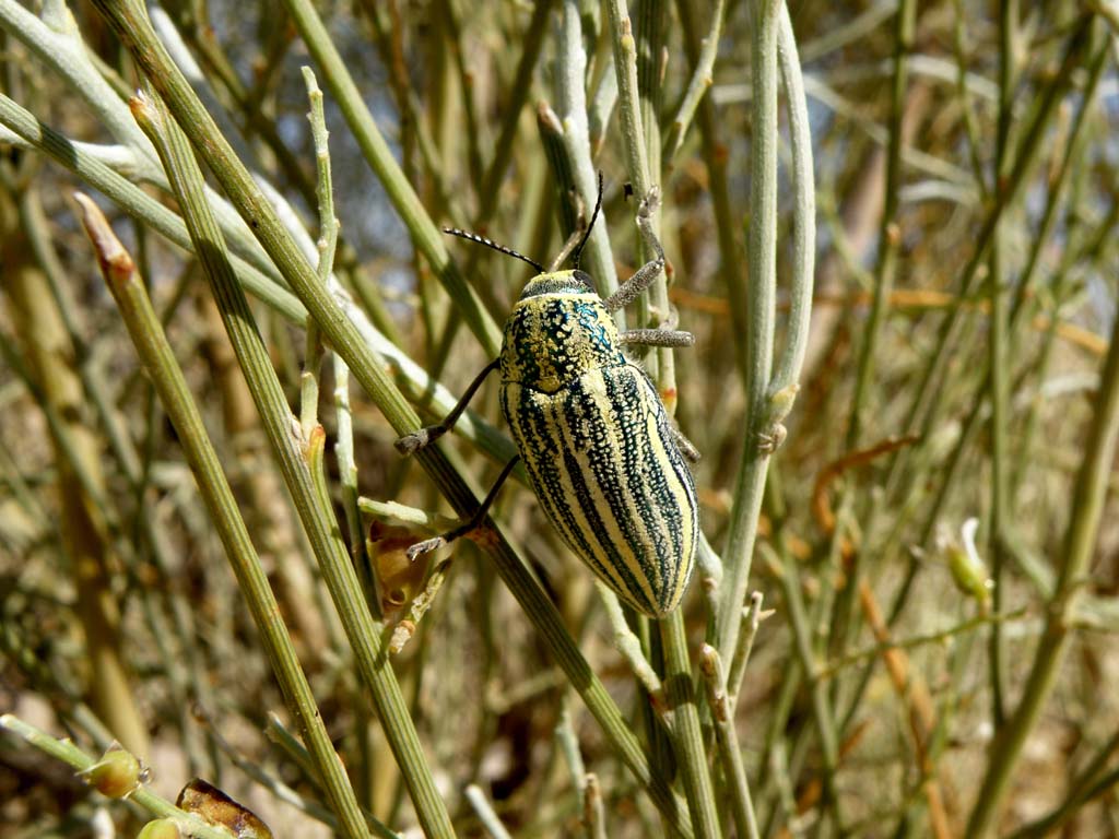 Julodis aristidis Lucas, 1860 - 20 km W Nefta, a pochi chilometri dal confine Algerino - 2 Aprile 2010. Su Retama sp. Inizio con questa specie, l'unica del genere trovata in serie, un breve report sul nostro recente viaggio in Tunisia cui hanno partecipato anche mia moglie Barbara e Gianluca Magnani. Come ho scritto in altra occasione, il tempo non è stato clemente e, soprattutto la stagione era drammaticamente indietro (almeno un mese). Evidentemente anche nel caldo sud e, principalmente, nel nord del caldo sud, l'inverno è stato vero inverno. Poco o niente era fuori per cui le foto rappresenteranno, salvo poche eccezioni, le piante ospiti di alcune specie di Cerambycidae che posterò nel settore apposito.