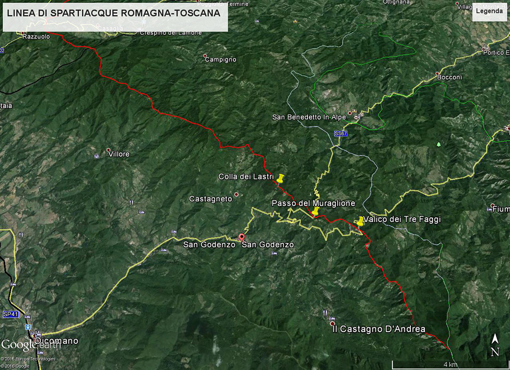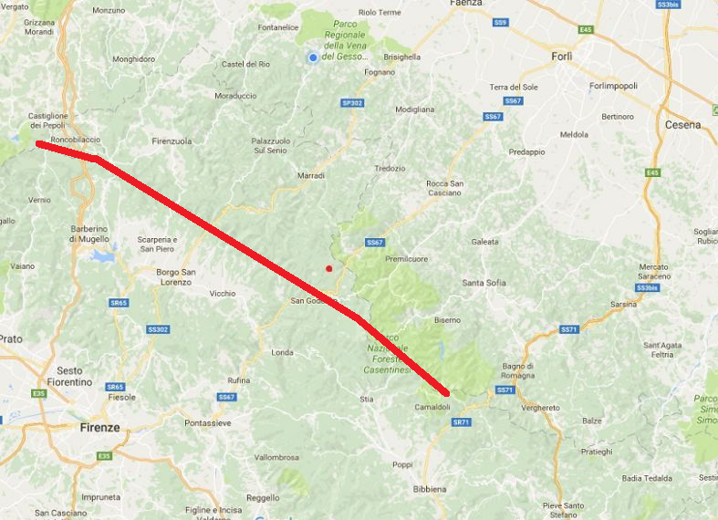 In questa foto presa da Google Earth, ho tracciato un po' alla buona la linea spartiacque nella zona di San Godenzo; le acque a sud della linea rossa alimentano la Sieve, mentre quelle a nord alimentano il Rabbi, il Montone, il Lamone, il Senio, ecc.