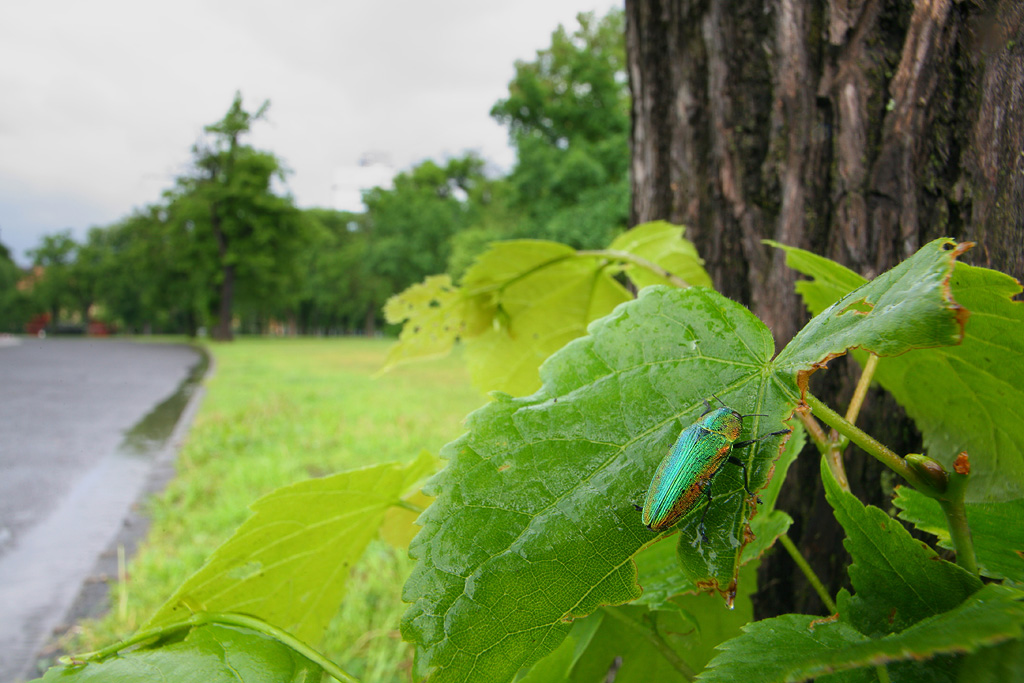 I've taken the first observations on Lamprodila rutilans in Hungary. The first specimens were getting out in the Budapest's city park. This is the most early data for me of these beetles. I took a few pictures of a specimen attacked by ants after its emerge from the exit hole. Most of the beetles were low near the ground and feeding fresh leaves.