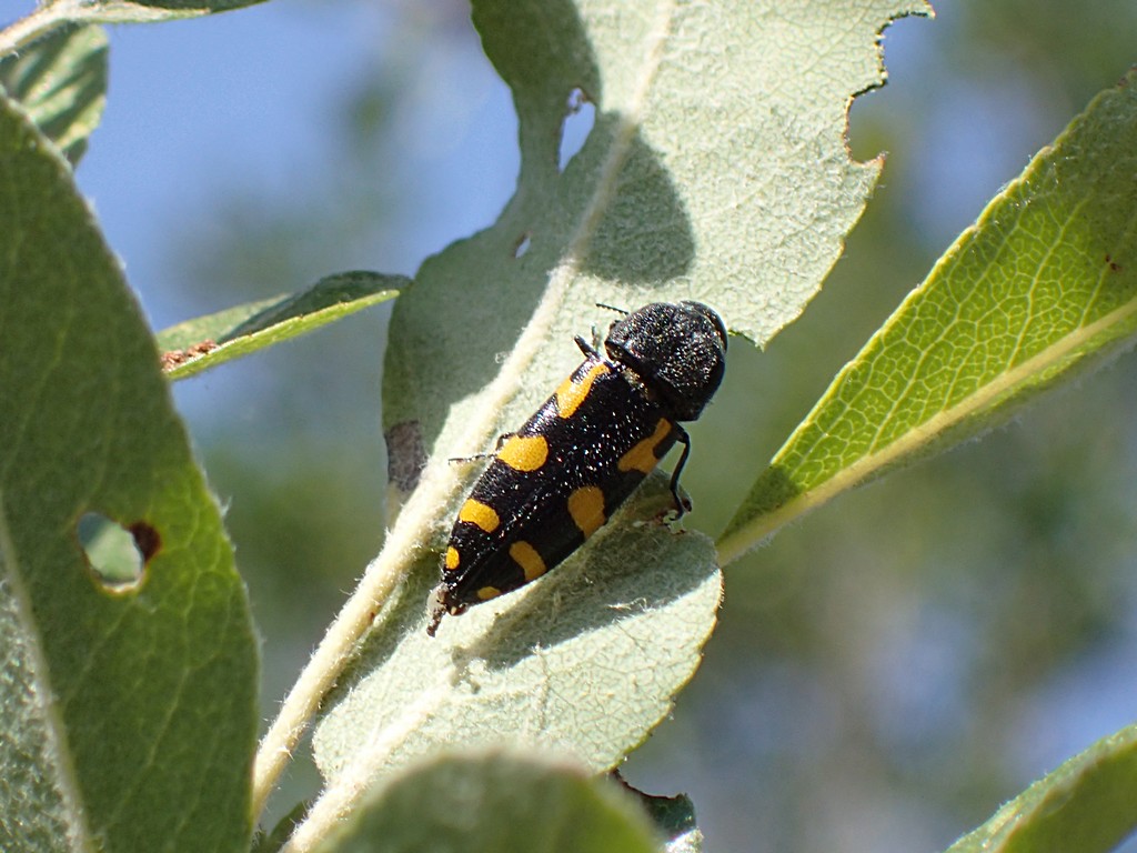 Probabilmente il più comune Buprestidae italiano legato alle Rosaceae, soprattutto Crataegus e Prunus spinosa, ma anche molte altre, comprese quelle coltivate (mandorli, albicocchi, ecc.) La larva si sviluppa nei rami vivi, e l'adulto esce praticando un caratteristico foro rotondo. Ho notato che piante come i Crategus hanno una incredibile resistenza all'attacco di questa specie. Tempo fa ho osservato un ramo lungo una sessantina di cm e largo sui 3-4 cm, con 14 fori d'uscita, ed era ancora vivo e vegeto, con foglie e fiori! Ad aprile, in questa stessa località, Prunus e Crataegus erano pieni di esemplari in attività, sia come questo, che con le macchie anche su pronoto e fronte. Oggi ce n'erano rimasti pochi, quasi tutti osservati in volo. Questo era intento a mangiare una foglia di pero selvatico.