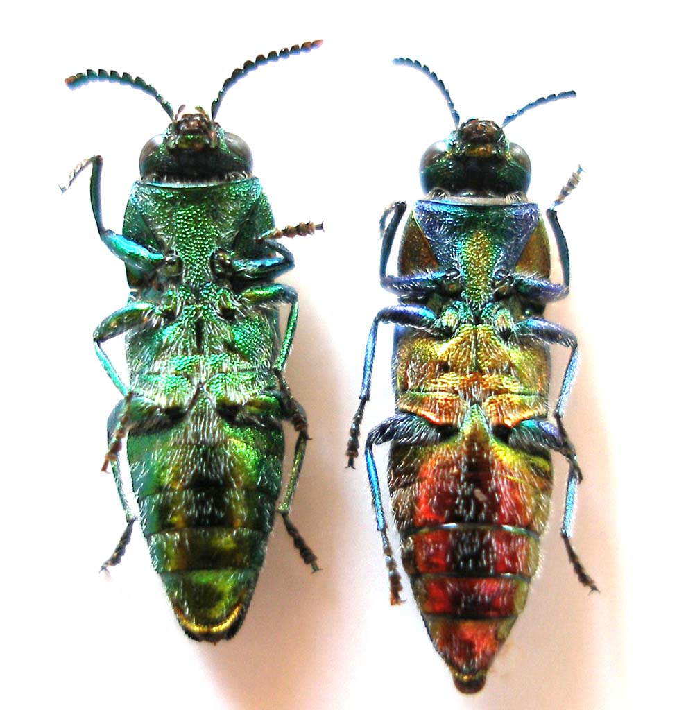 Bene! E' una bella coppia (che, di grazia, considero già in coll. Baiocchi) di Anthaxia (Cratomerus) eugeniae ssp. eugeniae Ganglbauer 1885. La femmina per la verità è un pò cianescente, ma comunque ne approfitto per spiegare come si può distinguere la femmina di questa specie dalla femmina di Anthaxia (Cratomerus) hungarica ssp. hungarica (Scopoli) 1772: come si vede nella foto, il prosterno, ossia la parte centrale del lato ventrale del pronoto (per capirci: il sotto-gola) è di colore diverso dal resto della parte ventrale del corpo. In questo esemplare in particolare è blù con il centro verde-oro. Negli esemplari ancor più tipici di eugeniae, che si trovano per esempio in Grecia e Turchia occidentale, il prosterno è normalmente verde, a differenza della hungarica la cui parte ventrale della femmina è uniformemente rosso rubino.