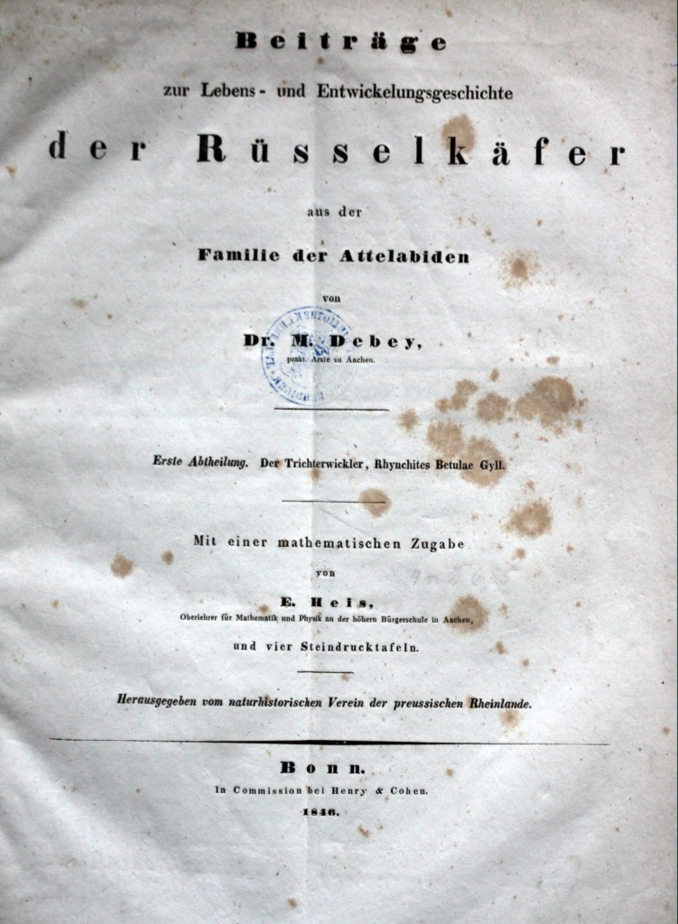 La caratteristica forse più interessante è la modalità con cui la femmina di Deporaus confeziona il sigaro. Molti autori (soprattutto nel passato) se ne sono occupati. Il meno noto, anche se è stato tra i primi, è M. Debey, che nel lontano 1846 pubblica un contributo sull'etologia della specie. Ne fa parte un corposo saggio di E. Heis su (tenetevi forte!) gli aspetti matematici e geometrici della curva di taglio che consente l'arrotolamento. Confesso che questa parte è così densa di formule che dopo un po' l'ho lasciata perdere. Eccovi il frontespizio e due tavole della mia copia  di questo lavoro: Per oggi penso di aver messo abbastanza alla prova la vostra pazienza. Alla prossima