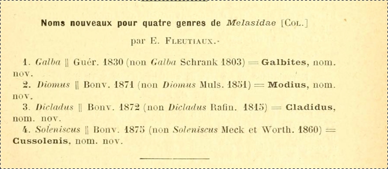 Il nome del genere Galba Guér., 1830 fu poi cambiato in Galbites da Fleutiax, nel 1918, essendo Galba un genere già creato nel 1803 da Schrank per alcuni Molluschi Gasteropodi.