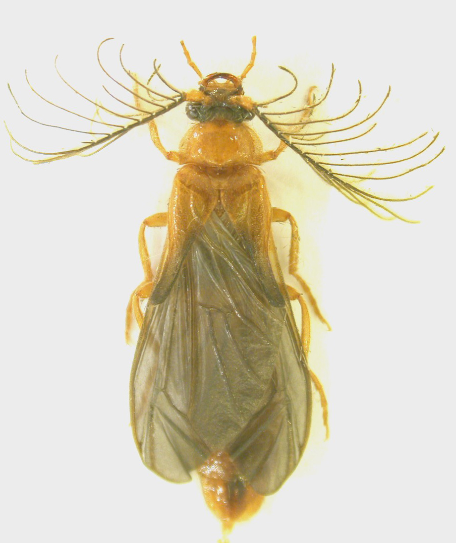 I Phengodidae sono una strana e bellissima famiglia di coleotteri che ancora non era rappresentata nel forum; annovera specie diffuse dal Cile sino al Canada meridionale, caratterizzate da dimorfismo sessuale assai accentuato (femmine attere e larviformi, maschi alati). Sia le larve che gli adulti (per lo più le femmine) sono capaci di emettere bioluminescenza. Questo maschio, lungo 2 cm, appartiene al genere Phengodes. Non l'ho ancora determinato, attendo che mi arrivino dei lavori... |