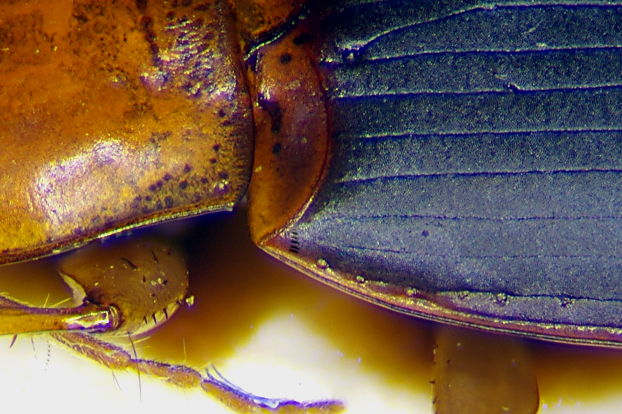 Poi il dentino omerale, che più che un dentino, è una sporgenza "a tetto", che fa sì che guardando di lato l'angolo tra orlo basale e lato dell'elitra appaia molto più acuto in melanocephalus che in cinctus, tenendo presente che maschi e femmine della stessa specie non sono uguali. Di seguito: