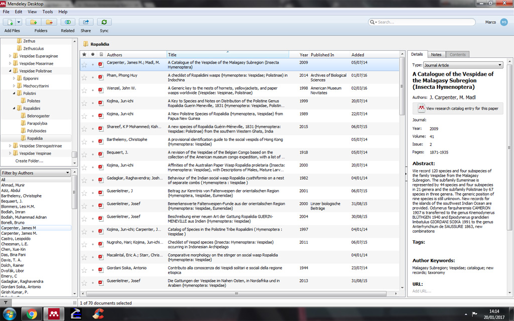 io per un po' di tempo ho organizzato la bibliografia sui Vespidi in cartelle per ogni sottofamiglia, ma con il continuo aumentare dei pdf la situazione diventava complicata, soprattutto nella cartella degli Eumenini che iniziava a includere diverse centinaia di lavori.
