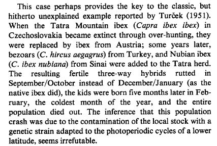 2 - dal momento che sui Tatra c'era, prima che la portassero all'estinzione, Capra ibex (o, se vogliamo, Capra ibex ibex), insomma, lo stambecco alpino, capisco che abbiano voluto reintrodurlo dall'Austria, ma quale mente malata può aver partorito l'idea di introdurre altre due specie vicine (o sottospecie), per rinforzare la popolazione iniziale? Considerando poi che una, Capra aegagrus, viene da ambienti non troppo diversi da quelli alpini e delle montagne centroeuropee (almeno, le popolazioni delle montagne turche), ma l'altra, Capra nubiana, viene da ambienti totalmente diversi, molto più caldi e aridi, ed ovviamente deve avere adattamenti diversi, anche per quanto riguarda il periodo riproduttivo, a prescindere dal fatto che venga considerata specie o sottospecie.