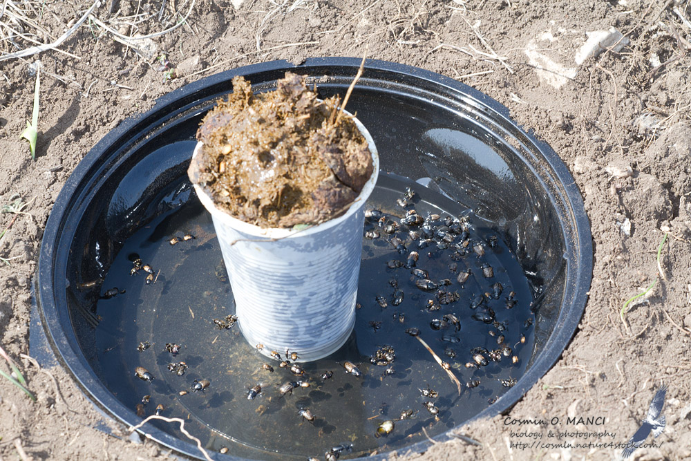 Come e gia detto quelli grandi vado subito sotto ... io uso un sistema differente... e trappola sia in campo solo per un po di ore (da 10 a 14 normalmente). Mi scusi se scrivo in inglese ... e piu facile. My system is to use a plate (not a very deep one) with water, this is put at soil level (digging a little) and in this way even species that fly little or none come inside attracted by a plastic cup filled with own production or what I find there. As I said this is a system to use for few hours after will dry and will be very little attractive. Also from my observations this works the best in spring. Also I have a different method to collect from dung (not own) ... I always carry several plastic bags with me and when finding some "pancakes" I just dig everything and put it in plastic bag, and the plastic bag will be put in another one and another one (3-4 layers) ... as the beetles will keep digging  . Reaching home or at the camp I put everything in a big plastic box (cca 20-30 liters) and with a cap that breath (cut that plastic sheet and glued there a textile mesh. That big box has one one side 3 holes (size of holes depends on what I hope to find ... but I use a drill of cca 1 cm), 2 of the hole in corner of that side and one in the middle. This box is left in the sun and under holes I pus some recipients with water. The dung will keep drying and drying and all run around the box until the holes and from there in water. Working for this cca 15 minutes and after that having free time to do what else I want there, this system will collect all specimens more or less clean and without me working. If I think that deserve it I leave this on for few days until everything is solid dry. And probably 99% from what it is there is collected.