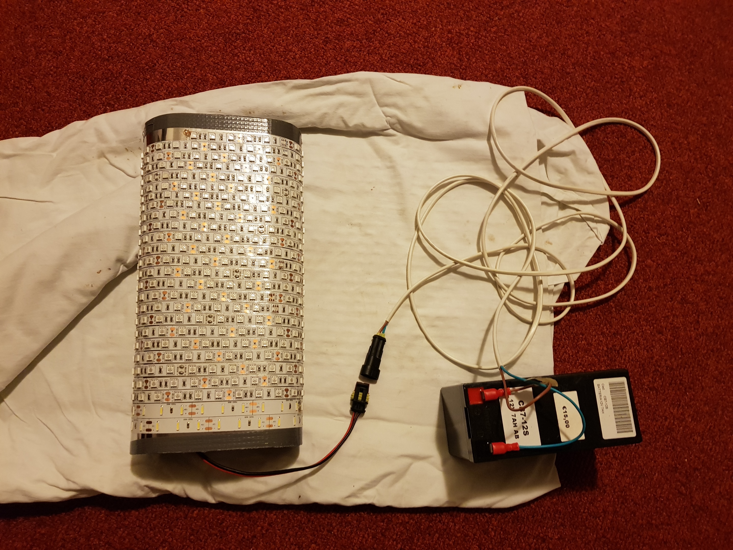 2) I led sono arrotolati attorno a un tubo da stufa, che ha il duplice vantaggio di disperdere il calore e non essere eccessivamente pesante. Non sembra ma anche i led fanno un certo calore ed è meglio disperderlo.