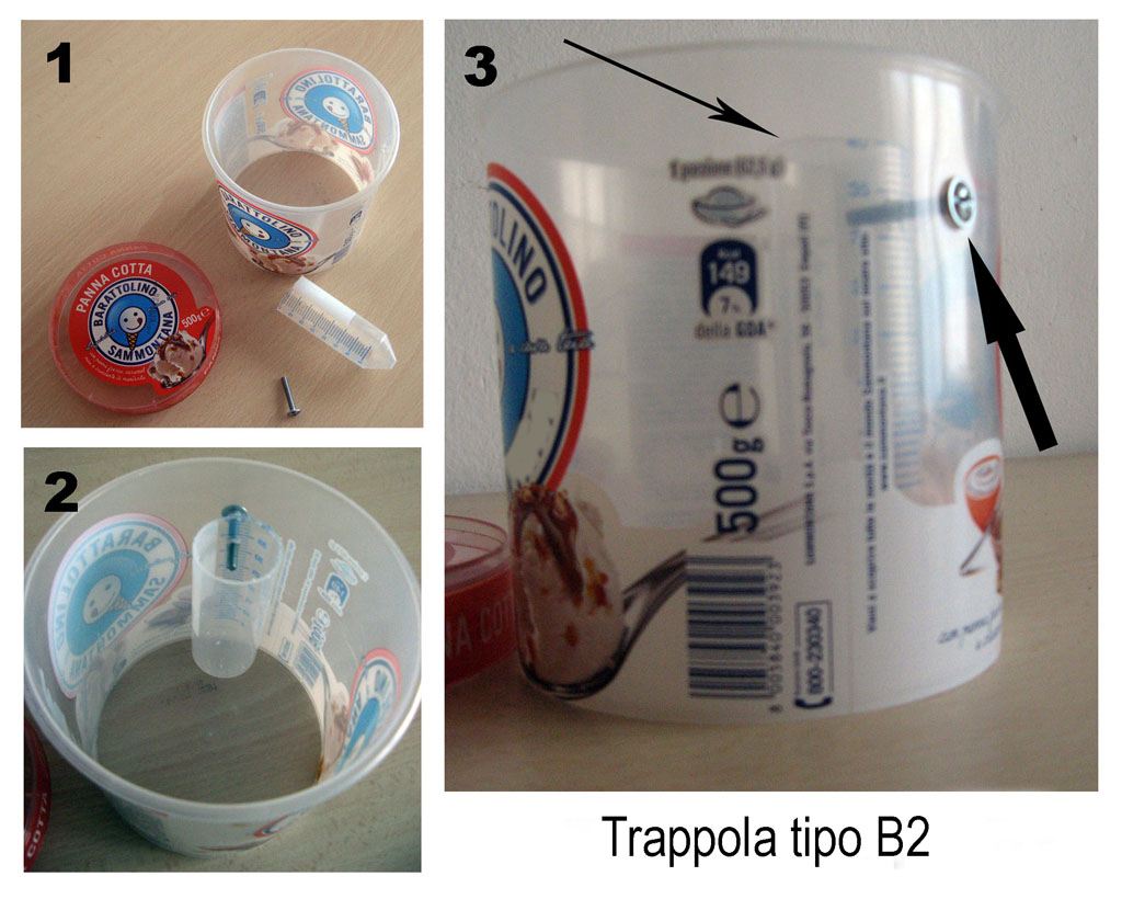 La trappola di tipo B è sempre ottenuta da un recipiente da gelato, ma del tipo “barattolino” :) . Sul coperchio è presente il foro d’ingresso per gli insetti; qui ne faccio uno solo, sul lato opposto a quello in cui si trova il barattolo con l’esca. Il bicchierino da yogurt per l’esca è appeso al coperchio a due punti del suo bordo (per evitare che si rovesci) mediante filo di ferro: come si vede nella foto, un punto è fisso e l'altro mobile, per inserire più facilmente l'esca.
