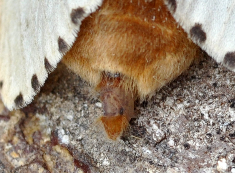 io da ragazzo ho allevato Limantria , per me il pezzo che esce dall'addome serve principalmente per emettere i feromoni che servono ad attirare i maschi e penso che arrivino anche da qualche Km di distanza , poi ha preparato il substrato in cui deporre le uova aspettando il maschio .