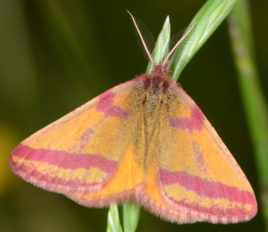 A vantaggio delle 'quote rosa' tra i lepidotteri, aggiungerei per lo meno i due Erebidi Tyria jacobaeae, con ali anteriori grigie e rosa carico e posteriori quasi uniformemente rosa carico, e Miltochrista miniata, rosa più pallido. Tra i geometridi, Rhodometra sacraria può presentare forme con ali anteriori ampiamente di colore rosa (direi rosa "gelato alla fragola"), credo soprattutto se schiuse in autunno da pupe che hanno subìto cali di temperatura. Tra gli Sfingidi, oltre alla già citata Deilephila elpenor è ampiamente rosa carico anche la congenere D. porcellus. In questi due casi, nel 'battezzarle' pensò al colore rosa dei suini (che però non mi sembra mai così intenso) Linneo stesso (Elpenore, compagno di Ulisse, era stato trasformato in maiale, come altri, dalla maga Circe).