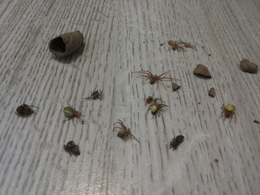 Guardate qua che cosa è caduto per terra spaccandosi in due e seminando sul pavimento ragni di diverse specie e dimensioni! Chissà se qualcuno era ancora vivo :o