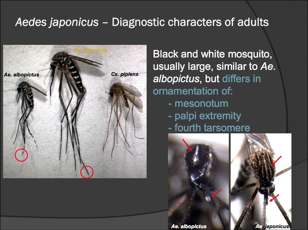 Riporto qui appresso tre diapositive, tratte da un'interessante presentazione (Autore: Francis Schaffner - qui l'intera presentazione in pdf) dal titolo: "Introduction and establishment of new invasive mosquito species in Europe: just the beginning?" In queste tre diapositive sono riportate alcune informazioni su Aedes koreicus Edwards, 1917, specie già introdottasi in Belgio nel 2008 e sui caratteri che permettono di differenziarla dalle, a quanto pare, assai simili Aedes japonicus Theobald, 1901, e Aedes albopictus (Skuse, 1894).